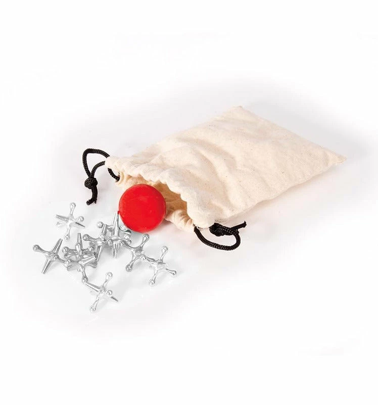 The set contains 10 metal jacks & bouncy ball in a cotton drawstring